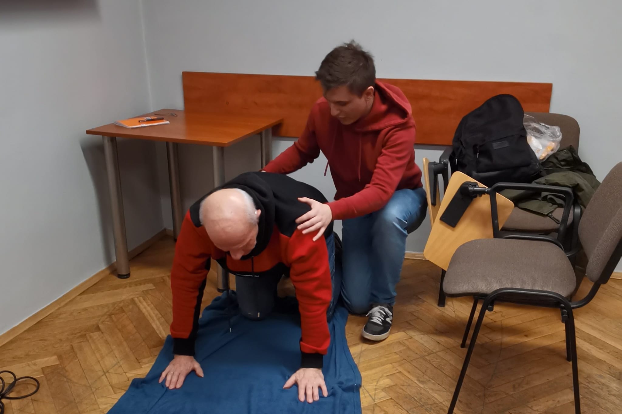 Następnym tematem ćwiczeń były zaburzenia stabilności postawy. Pan Krzysztof pokazał między innymi jak bezpiecznie podnosić cięższe przedmioty i technikę samodzielnego, bezpiecznego wstawania po upadku.